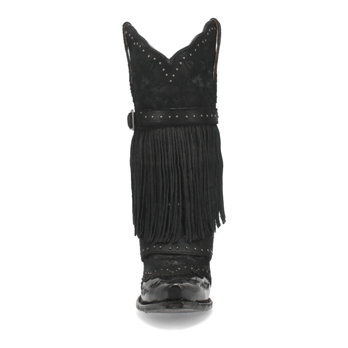 Life will feel like a Bed of Roses in this stunning boot. Crafted with premium leather and loaded with details from the rose-embossed leather shaft down to the buckled fringe and metallic snip toe. Comes with a Soft Strike Removable Orthotic for added comfort.