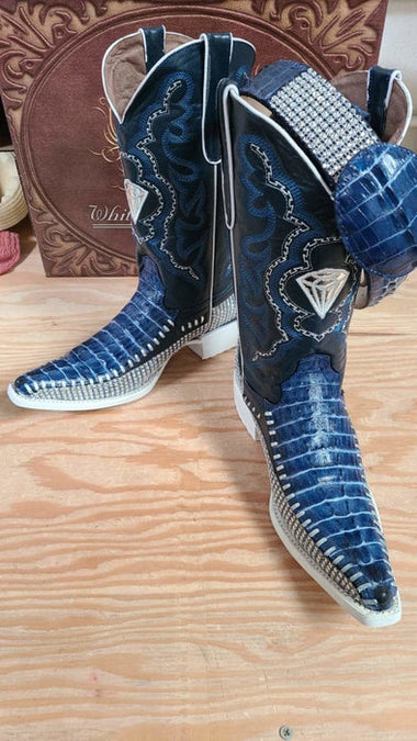 Confeccionado a mano por Maestros Artesanos Piel: Cuero Vacuno Grabado Grabado Caiman Cola Estilo: Vaquero Color: Azul con Diamantes de Imitacion Ancho: 1.5" (1.5 Pulgada) Marca: White Diamonds Boots Fabricado en Leon, Guanajuato, Mexico- $49.95