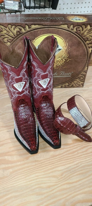 Confeccionado a mano por Maestros Artesanos Piel: Cuero Vacuno Grabado Grabado Caiman Cola Estilo: Vaquero Color: Vino con Diamantes de Imitacion Ancho: 1.5" (1.5 Pulgada) Marca: White Diamonds Boots Fabricado en Leon, Guanajuato, Mexico- $49.95