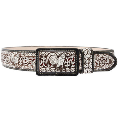 Confeccionado a mano por Maestros Artesanos Fina Piel de Cuero Vacuno Corte Laser Decorado con Gallo Estilo: Vaquero Color: Negro Ancho: 2 1/8" Pulgadas Marca: White Diamonds Boots Made in Mexico- $79.95