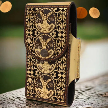 Hecho a mano por Artesanos / Handmade Fina Piel de Cuero Vacuno / Genuine Leather Decorado con Centenarios color Oro Corte Laser Estilo: Vaquero Color: Cafe con Oro / Brown and Gold Ancho / Width: 2" FUNDA PARA SMARTPHONE OPCIONAL (+$59.99)? Made in Mexico- $149.98