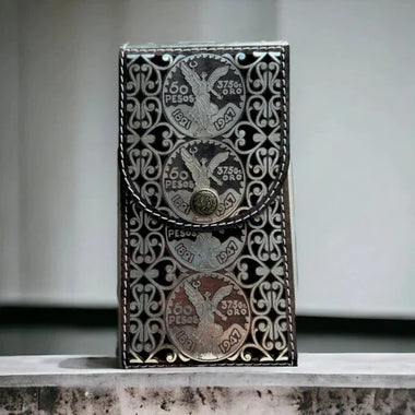 Hecho a mano por Artesanos / Handmade Fina Piel de Cuero Vacuno / Genuine Leather Decorado con Centenarios color Plata Corte Laser Estilo: Vaquero Color: Negro con Plata / Black and Silver Ancho / Width: 2" FUNDA PARA SMARTPHONE OPCIONAL (+$59.99)? Made in Mexico- $79.99