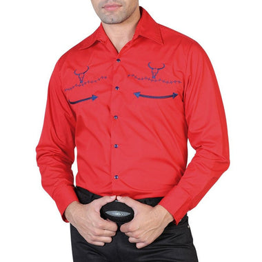 Camisa Vaquera Bordada para Hombre Camisa Vaquera Bordada Material: Algodon y Polyester Color: Rojo- $69.95