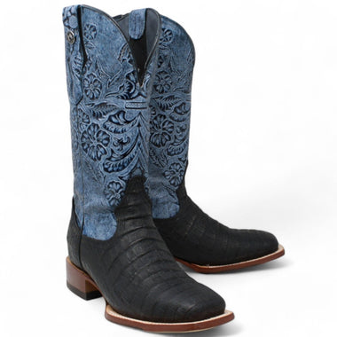 Color : Matte Black Top: Blue Hand Tool Print Heel : Stockman Heel Outsole: Leather Sole Toe: Square Toe Vamp: Caiman Belly Print Cowhide Pull tabs Cushion comfort insole Leather lining Western stitching Style: TML207103- $240.00
