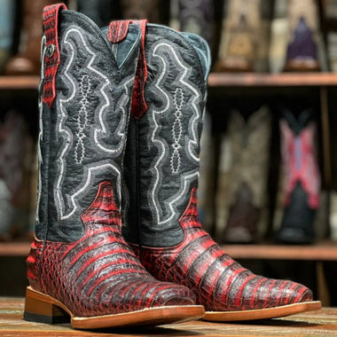PRODUCT DESCRIPTION Color: Red Wine with Black Shadowing Top: Marble Black Heel: Stockman Heel Outsole: Leather Sole Toe: Square Toe Vamp: Caiman Belly Print Cowhide Pull tabs Cushion comfort insole Leather lining Western stitching Style: TML207069- $260.00