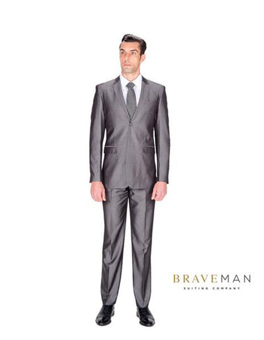 You're going to stop traffic in this one. This modern fit 2 button suit is made from the shiniest, flashiest, sharkskin fabric on the planet. It features side vents, and flat front pants. Watch out with this one.- $205.00