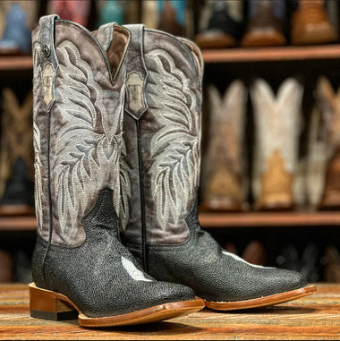 Color : Classic Black Top: 12" Toscana Blue Heel : Stockman Heel Outsole: Leather Sole Toe: Square Toe Vamp: Stingray Print Cowhide Pull tabs Cushion comfort insole Leather lining Western stitching Style: TML207115- $240.00
