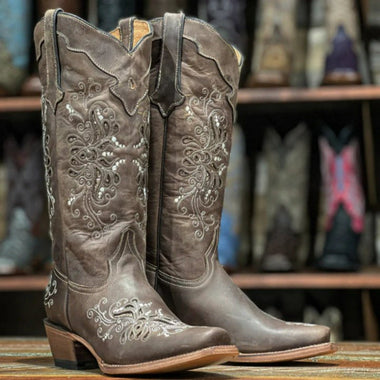PRODUCT DESCRIPTION Color: Chocolate Pull Up Top: Chocolate Pull Up with Champagne Inlay Heel : Cowgirl Heel Outsole: Leather Toe: Square Toe Vamp: Cowhide Leather Pull tabs Cushion comfort insole Leather lining Western stitching Style: TML205059- $250.00