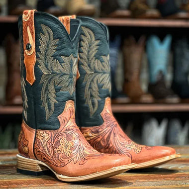 Men's Hand Tooled Square Toe Boots Brown and Tan