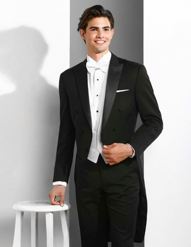 Jacquard de poliéster Solapa tipo chal negra mate Bolsillo doble con escoba Ventilación lateral Color: Negro- $219.00