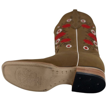 Confeccionadas a Mano por Maestros Artesanos Fina Piel de Cuero Vacuno Nobuck (Gamuza) Original Bordado con flores rojas Color: Topo Horma: Rodeo Tacon de 1.5" pulgadas de alto Marca: Botas White Diamonds Hecho en México- $179.95