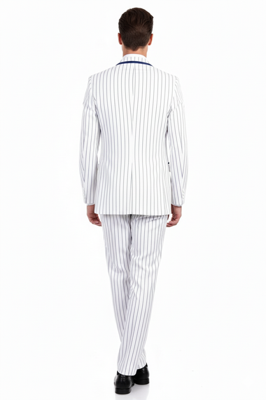 Showcase your bold and elegant style with this white and Royal blue pinstripe 3-piece suit, crafted for men who want to stand out with sophistication. The crisp white fabric with fine blue pinstripes creates a sharp, tailored look, while the matching blue vest, tie, and pocket square add a...- $199.00