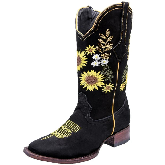 Botas de Gamuza Horma Rodeo para Mujer Color Negro con Girasoles WD