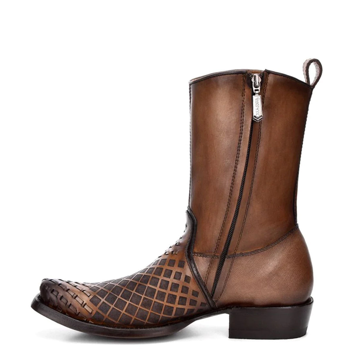 Cuadra boot for men in genuine bovine leather. It presents laser engraved details in geometric motifs, and handwoven details. Adjusted with inner zipper. With leather sole with TPU injection.