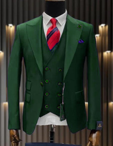 Este traje de corte moderno presenta una solapa ancha en pico, cierres de 1 botón, chaleco cruzado, aberturas laterales y pantalones delanteros planos a juego. 100% lana, fabricado en Turquía.