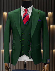 This modern fit suit features a wide peak lapel, 1 button closures, double breasted vest, side vents, and matching flat front pants. 100% wool, made in Turkey.