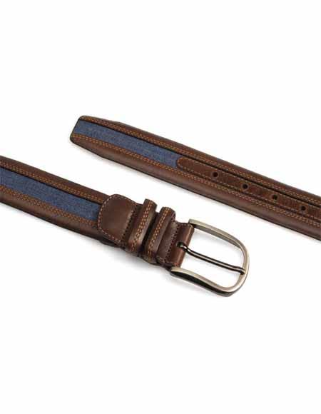 Distinctive Calfskin And Linen Combo Hi-Quality Full Nubuck Backing Brushed Nickel Buckle Adjustable Color: Brown/Jeans