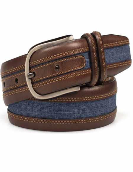 Distinctive Calfskin And Linen Combo Hi-Quality Full Nubuck Backing Brushed Nickel Buckle Adjustable Color:  Brown/Jeans
