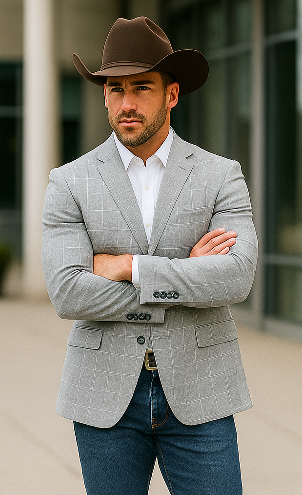 This 2 button blazer features a notch lapel, side vents, and a houndstooth windowpane plaid fabric.