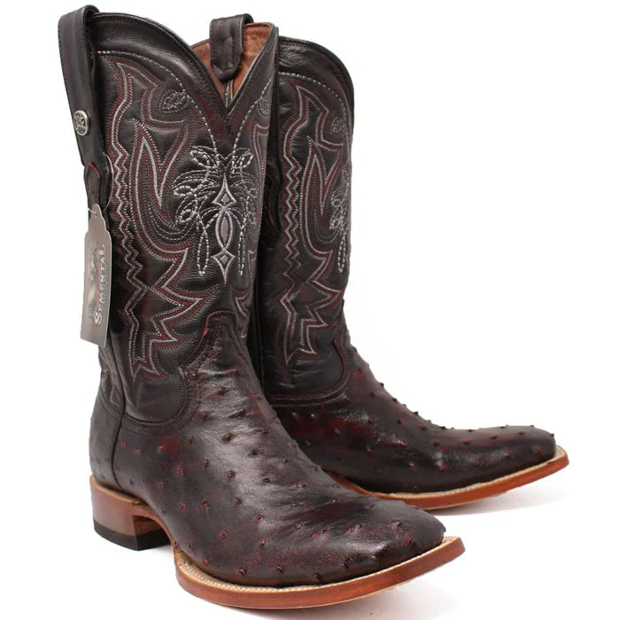 Men's Genuine Full Quill Ostrich Square Toe Boots Black Cherry