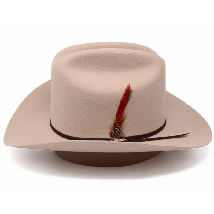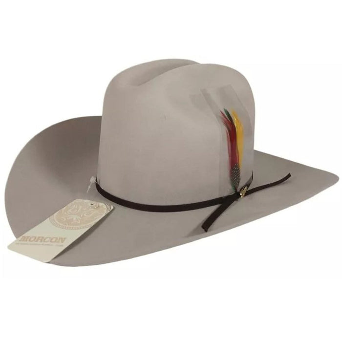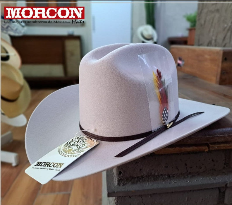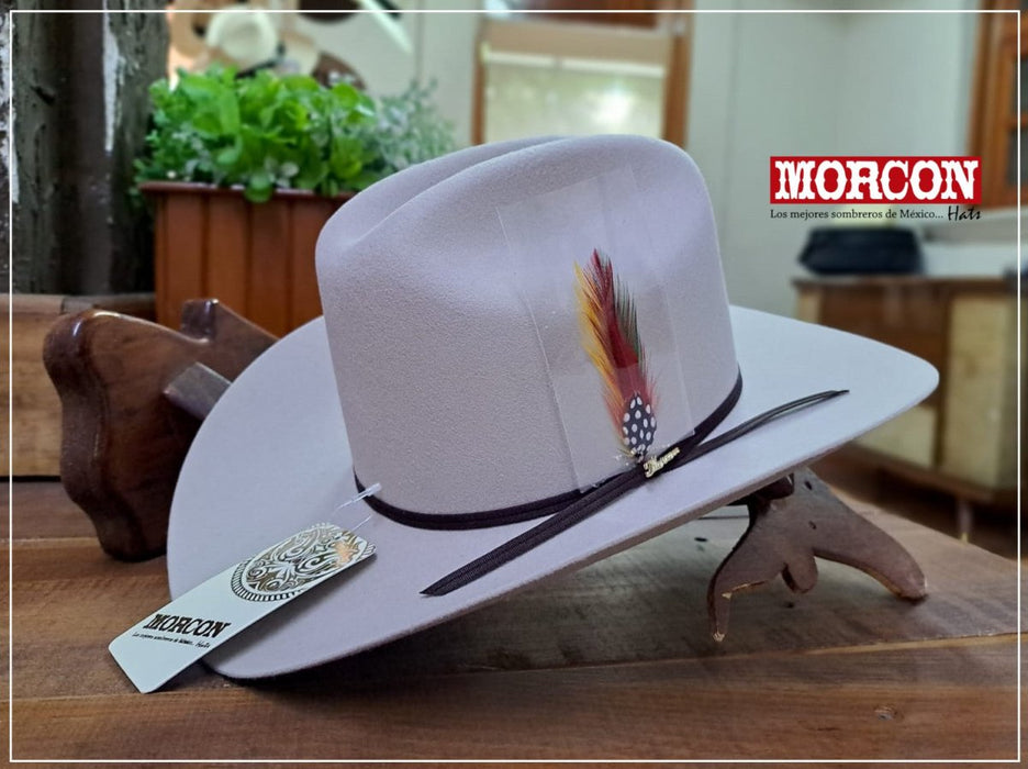 Esta hermosa Texana de la marca Morcon es una excelente eleccion para los amantes del estilo Western. Hecha en calidad 20X y con una pluma en la toquilla que resalta mucho a la vista, esta texana es una verdadera obra de arte. La fina lana de borrego utilizada para su fabricación es suave al tacto y cálida en el invierno, y su copa 4 1/2 y su ala de 3 1/2 le dan una forma perfecta para el clasico estilo Sinaloa.