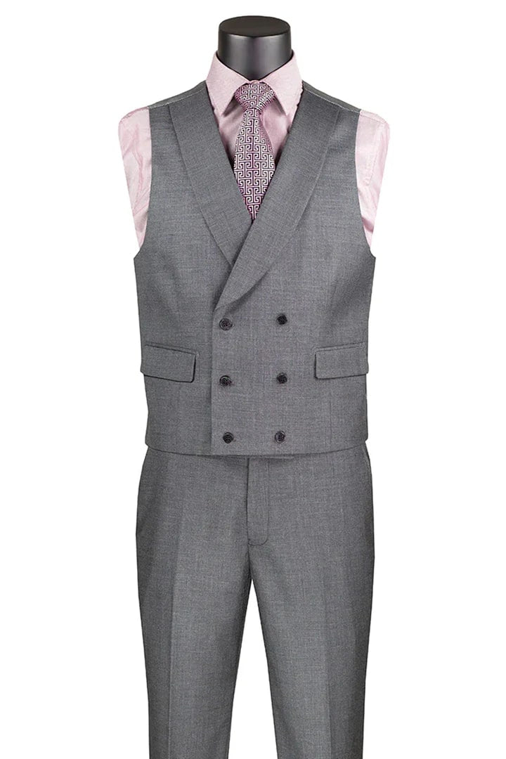 • This modern fit suit features a 2 button front, with a wide peak lapel, matching double breasted vest, and matching flat front pants, in a woven summer sharkskin material.